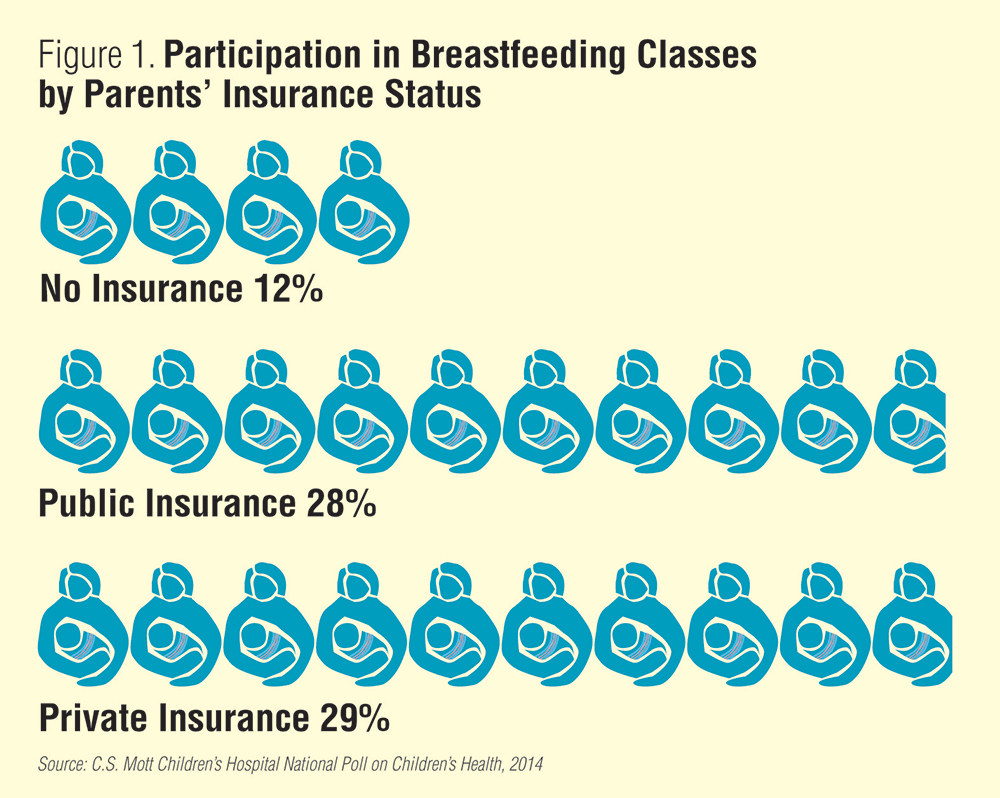 Davis MM, Moniz MH, O'Connell LK, Kauffman AD, Singer DC, Gebremariam A, Clark SJ. "Breast is best" but uninsured parents take breastfeeding classes less often. C.S. Mott Children's Hospital National Poll on Children's Health, University of Michigan. Vol 20, Issue 3, February 2014. Available at: http://mottpoll.org/reports-surveys/%E2%80%9Cbreast-best%E2%80%9D-uninsured-parents-take-breastfeeding-classes-less-often.