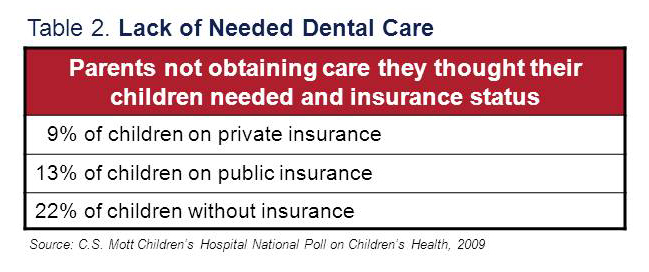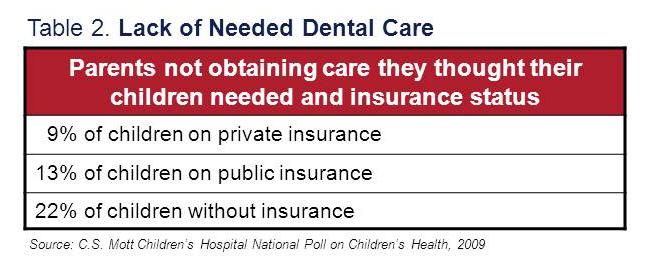 Overall, 12% of parents have not obtained the dental care they thought their children needed. Unmet dental needs are present at almost twice this rate among children with no dental coverage, with 22% of parents indicating they have not obtained dental care that their child needed (Table 2).