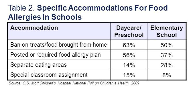 Parents who knew of a child with a life-threatening food allergy were asked whether schools had accommodations for food allergies, including: bans on treats/food brought from home, a posted or required food allergy plan, separate eating areas for children with food allergies, staff training for food allergies, or special classroom assignments.