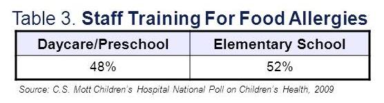 About one-half of parents indicate that their children’s daycare, preschool, or elementary school has staff training specifically for food allergies (Table 3).