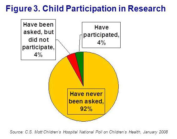 This poll also indicates that there is the potential for many more children to participate in research than have done so before. Only about 4% of parents have had a child participate in research, and the vast majority have never been asked. But about one-third of parents say they would consider allowing their children to participate if a drug had already been proven safe in adults, or if their children had a particular disease being studied.
