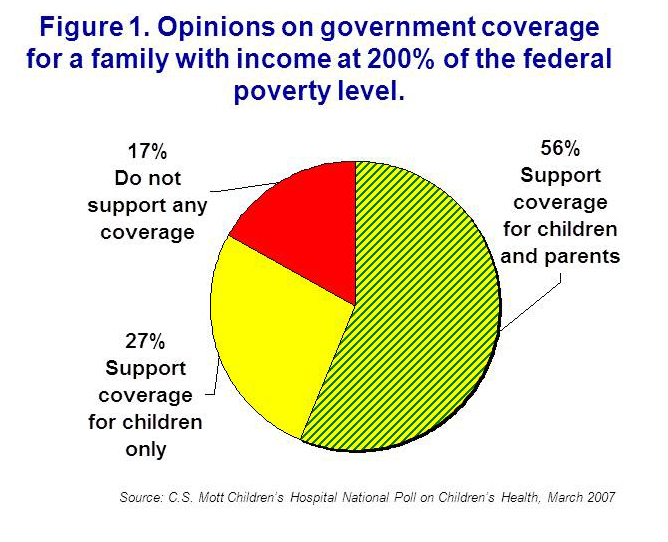 In March 2007, the C.S. Mott Children’s Hospital’s National Poll on Children’s Health surveyed a nationally representative sample of households with and without children under age 18, regarding who should qualify for government-sponsored health plans based on yearly family income in ranges served by SCHIP.