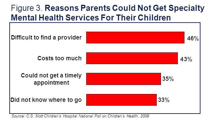 For those parents who say there has been a time when they could not get the mental health services they wanted for their children, nearly one-half said the reasons were that it was difficult to find a provider or that it costs too much, and about one-third said they could not get an appointment in a timely fashion or did not know where to go for specialty mental health services (Figure 3).