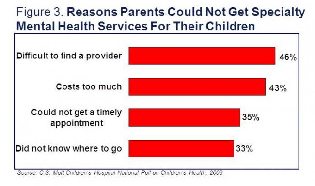 Davis MM, Singer DC, Butchart AT, Clark SJ. Mental health services for children and adolescents: Missed opportunities in primary care & barriers to specialty care. C.S. Mott Children’s Hospital National Poll on Children’s Health, University of Michigan. Vol 5, Issue 4, December 2008. Available at: http://mottpoll.org/reports-surveys/mental-health-services-children-and-adolescents-missed-opportunities-primary-care.