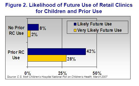 Given the relatively small number of retail clinics nationwide in 2007, a remarkably high proportion of children and adults have used retail clinics for their health care. This trend, and the fact that prior users are so satisfied with the care they have received, suggest that the demand for retail clinic care for children will rise steadily.