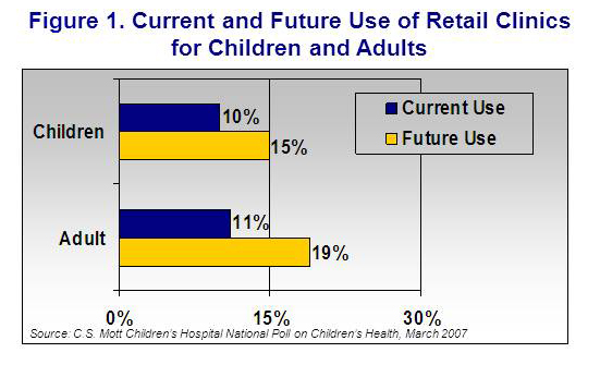 In March 2007, the C.S. Mott Children’s Hospital National Poll on Children’s Health found that 10% of children and 11% of adults have used a retail clinic. Moreover, 15% of children and 19% of adults are very likely or likely to use a retail clinic in the future (Figure 1).
