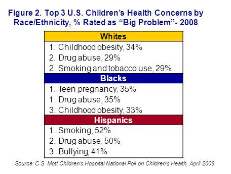 This annual assessment of public concern about health problems facing children shows a shifting set of worries among adults about children in their communities. The main difference compared with last year’s poll is that childhood obesity now is rated as the #1 concern. In addition, lack of opportunities for physical activity is one of the top 10 concerns, underscoring the importance placed on childhood obesity as a major problem in adults’ minds. Of note, although other research has shown that Hispanic youth are at particularly high risk for obesity, this problem was rated lower by Hispanic adults than several other concerns.