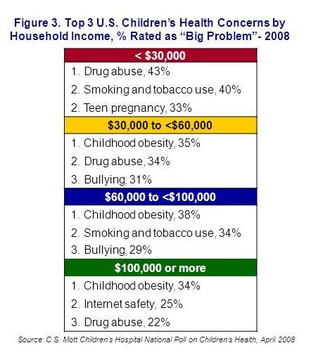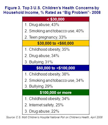 The National Poll on Children’s Health found that adults from low-income households (<$30,000 per year) saw drug abuse, smoking and tobacco use, and teen pregnancy as the biggest health concerns for children. In contrast, high-income households (>$100,000 per year) were more likely to see Internet safety as a big problem for children in their community (Figure 3), along with obesity and drug abuse.