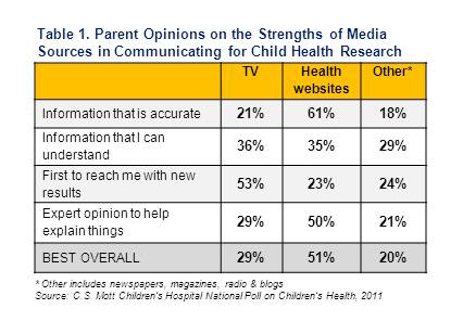Parents disagreed about which media source does the best job in communicating child health information that is accurate, easy to understand, timely, and supported with expert opinions.  About half of parents believe that health websites do the best job overall while 29% rate TV as the best overall source (Table 1)