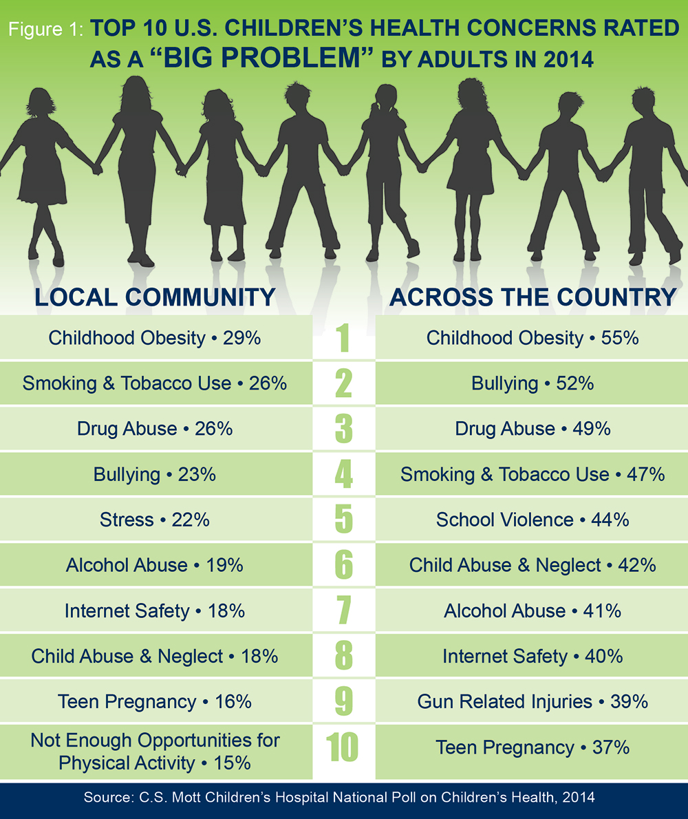 The results of this latest Poll reinforce the consistent concern of adults about the problems of childhood obesity, smoking and tobacco use, drug use, and bullying for children. Moreover, the top 10 child health concerns reveal how strongly the public perceives that behaviors – of the children and the adults around them – are a root cause of many problems.