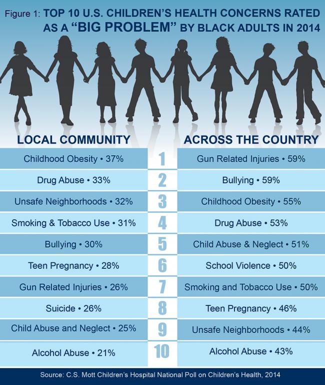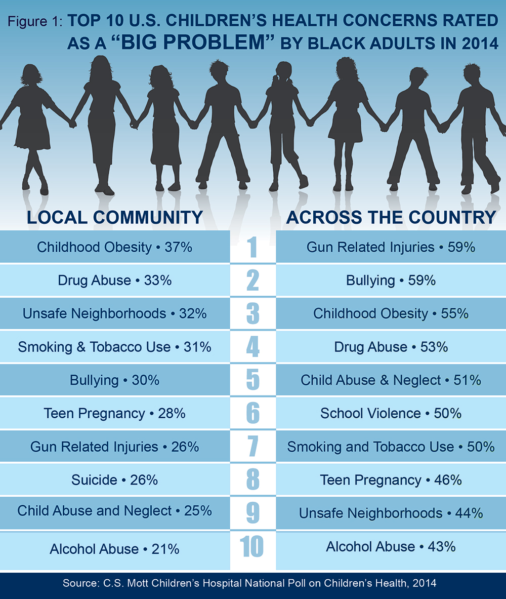 In comparison, other child health concerns rated as a “big problem” for children and teens in the respondents' own community include: ADHD (14%), unsafe neighborhoods (14%), sexting (14%), depression (13%), school violence (13%), suicide (12%), motor vehicle accidents (12%), gun related injuries (12%), hunger (11%), sexually transmitted infections including HIV/AIDS (11%), autism (9%), food allergies (7%), racial inequality in infant mortality (6%), outbreaks of illnesses that can be prevented by vaccines (5%), safety of medications (5%), and safety of vaccines (4%).