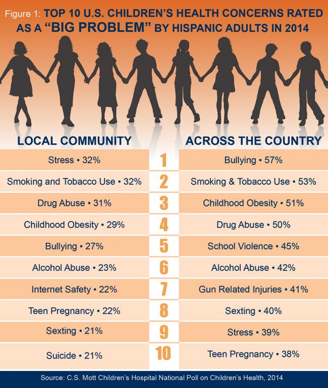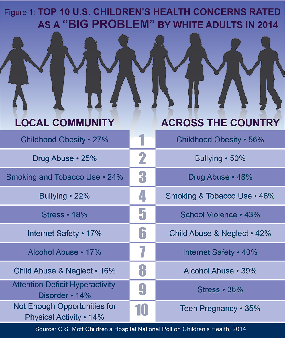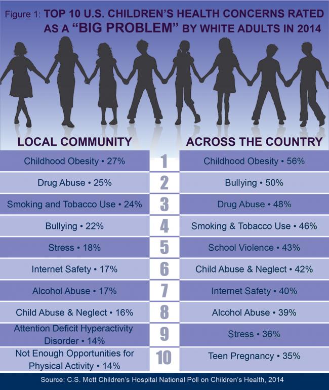 In this year’s eighth annual survey of top health concerns conducted by the C.S. Mott Children’s Hospital National Poll on Children’s Health, adults rate health concerns for kids in their local communities as well as for kids across the U.S.