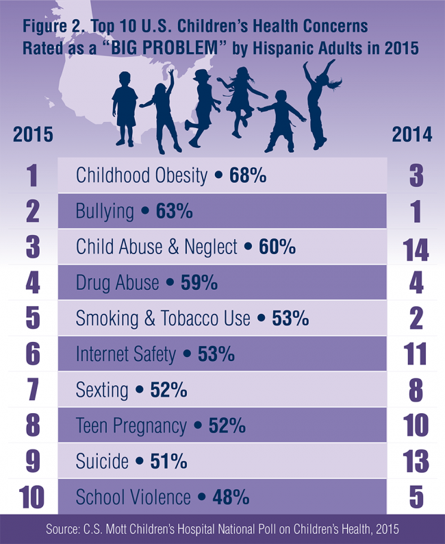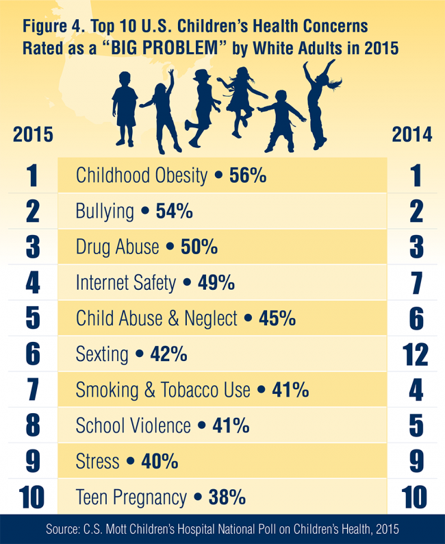 These three concerns were the same top-ranked child health problems as in 2014. But this year, Internet safety was the 4th most commonly identified “big problem”, up from #8 in 2014. Sexting received the biggest change in rating this year, from #13 in 2014 to #6 in 2015 (Figure 1).