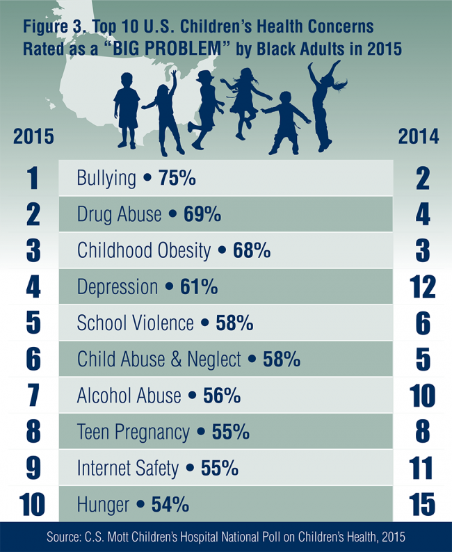 While groups of white, black and Hispanic adults all list childhood obesity and bullying among the top three child health issues, Hispanic adults list child abuse and neglect as the #3 health concern for kids across the U.S. (Figure 2). Black adults list depression #4, alcohol abuse #7 and hunger as #10 in the top 10 health concerns (Figure 3).