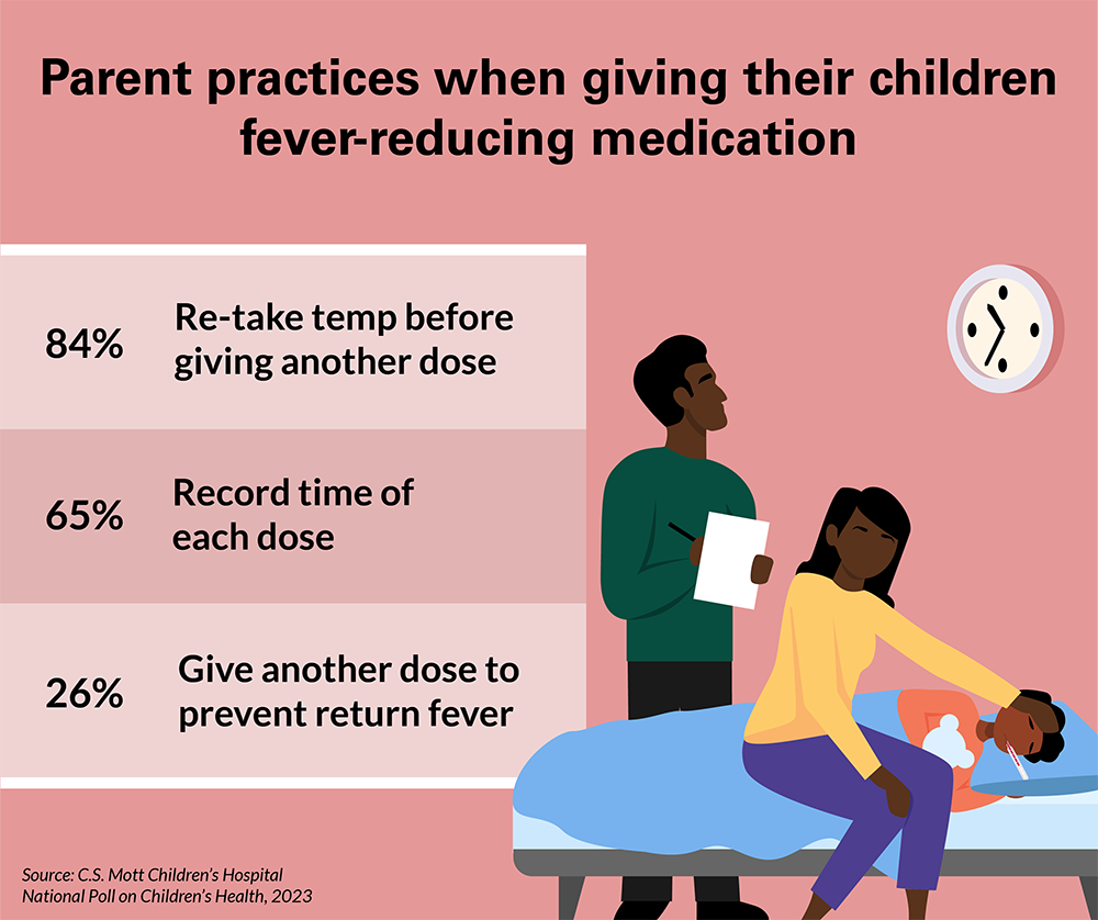 An important decision for parents is whether to give fever-reducing medicine. While child health experts typically define fever as a temperature at or above 100.4°F, one-third of parents in this Mott Poll indicated that they would give fever-reducing medication even at temperatures below this threshold. If the child is otherwise doing well, this level of elevated temperature does not require fever-reducing medication.