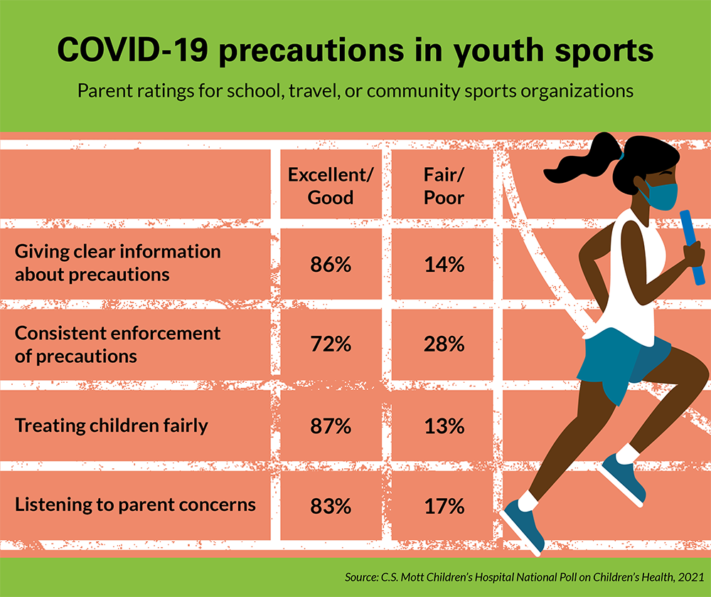 - 1 in 4 parents rate their child’s sports league as fair/poor for consistent enforcement of COVID-19 precautions.