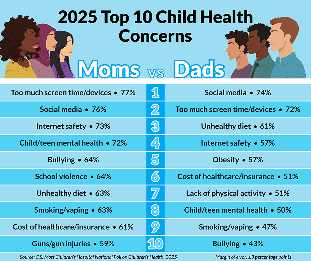 Woolford SJ, Schultz SL, Gebremariam A, Frisk C, Clark SJ. Top health concerns for 2025. C.S. Mott Children's Hospital National Poll on Children's Health, University of Michigan. Vol 47, Issue 6, August 2025. Available at: https://mottpoll.org/reports/top-health-concerns-2025.